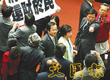 【本報訊】據中央社台北9日消息:「立法院」今天起進行本會期最後法案清倉,上午朝野對於議程安排、法案審議先後順序,即爆發表決大戰。接連十幾次表決,國親都佔多數,否決了民進黨黨團的提案,泛綠「立委」一度走到主席台前鼓譟抗議,更有人發生短暫推擠,互相潑水追逐,造成「院會」一度混亂。