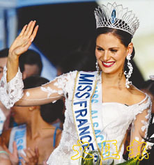 獲加冕後,2004年的法國小姐拉提塔.布萊格(Laetitia Bleger)向多維爾國際中心的觀眾揮手致謝。(路透社)