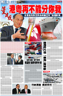 早前,社會輿論對本港是否還是珠三角的「龍頭大老」爭論不休,對此,董建成認為,與其不停爭論,倒不如將精力放在如何更好地將香港融入珠三角甚至整個華南地區的大經濟圈中。「香港應是珠三角的一部分,也是珠三角最重要的物流門戶,雖然香港特區與珠三角還需要有條行政區劃的界限,但一定要盡可能簡化貨物通關手續,日後在物流園出貨前可預先清關,過關時不再需要辦甚麼手續,只用電子掃描一下即可。簡化通關,加快物流,使香港與珠三角間貿易聯繫的方便程度,就像上海與華東一樣,基本上實現無縫對接。」