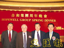 該集團昨日假九龍灣國際展貿中心三樓寰宇廳讌開數十席,除本港工商名流之外,還有許多內地地市級首腦到場。集團主席胡應湘、副主席何炳章及一眾首腦在交談中表示,合和集團今年除投資內地之外,還將在香港興建酒店。他們說,中央挺港措施陸續有來,個人遊來港人數屢創新高,港珠澳大橋興建在即,粵港合作日益緊密,基建方面的項目大有可為。有人更指出,合和的股價前年底是5.10元,但到上周五收市時已是14元,一年之內上升一倍多,反映出本港以及內地建築界的良好前景。