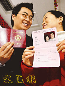 北京東城區婚姻登記服務中心內剛剛領到新版結婚證的新人合影留念。(資料圖片)