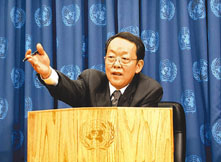 王光亞以聯合國安理會輪值主席身份舉行記者會。 (中新社)