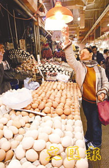 雞蛋供應稍減,有蛋檔加價一角。圖為一位主婦在燈下挑選雞蛋。 (美聯社)