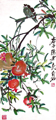 廣州劉艷平女士從20世紀80年代初開始收藏齊白石的木雕、繪畫、篆刻等作品,她收藏的一些齊白石的繪畫珍品從未展示過。圖為齊白石的《石榴八哥圖》。 ( 新華社)