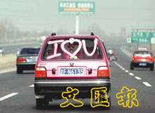 13日,北京年輕情侶將車窗寫滿「愛」的宣言,用特殊方式迎接情人節的到來。(中新社)