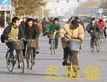 13日,北京突然颳起7級狂風,長安上騎自行車的人們在風中艱難地前行。(中新社)