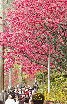 陽明山花季十三日正式登場,漫山盛放的櫻花吸引許多賞花民眾駐足欣賞。(中央社)