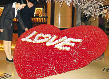 為迎接情人節﹐甘肅省蘭州一酒店用上千朵塑製「玫瑰」拼成一個巨大的「心」,營造節日氣氛。 (中新社)