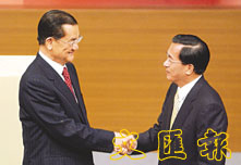 連戰(左)、陳水扁昨舉行歷史性「大選電視辯論」前,「先禮後兵」,握手以示風度。(法新社)