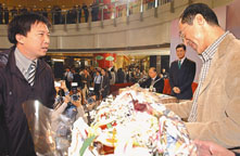 唐英年親自接收市民意見花籃。 (李志樑 攝)