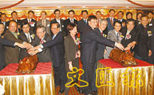 賓主於荃灣地區團體新春團拜酒會上主持切金豬儀式。(鄭群 攝)