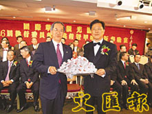 王如登(左)代表黎桂康,將委任狀頒予國際華商觀光協會主席黃士心。 (冼文達 攝)