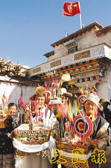 藏曆新年是藏族群眾最隆重的節日。21日,拉薩城關區納金鄉嘎巴村的農民手捧象徵五穀豐登的「切瑪」串門拜年。 (新華社)