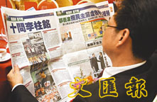 一名市民仔細閱報,了解李柱銘的反華言行。(趙焜崗 攝)