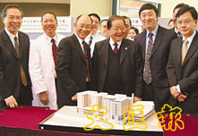 金耀基、鍾尚志、沈祖堯及霍泰輝等介紹中大醫學院公佈發展計劃的新臨床醫學大樓模型。(李志樑 攝)