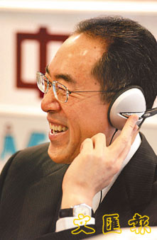 財政司司長唐英年昨天清早到電台接聽電話,不時與聽眾談得眉開眼笑。(趙焜崗 攝)