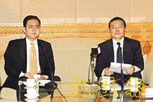 2004年河北省(香港)投資貿易洽談會昨日閉幕,省長季允石(左)及副省長才利民接受記者採訪。 (張偉民 攝)
