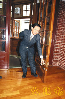 溫德中示範打開甘棠第最特別的一扇門,皆因它的設計是由工人為客人而開,手柄位特低,讓工人可用謙卑的姿勢為客人開門。 (冼文達攝)