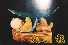 再有,荷葉脈莖—在泥塊上刻出脈紋而成後再接在孩兒之腰腹上。