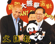 政務司司長曾蔭權、中聯辦副主任李剛、海洋公園主席盛智文和香港熊貓保育協會受託委員會主席胡經昌等昨日出席「親親大熊貓派對」開幕儀式。胡經昌表示,協會在4月發售慈善獎券以外,亦會推出初生大熊貓命名計劃,希望可以在一個月內籌得100萬元善款。