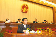4月2日,全國人大常委會法工委副主任李飛受委員長會議的委托,在十屆全國人大常委會第八次會議上作了關於釋法草案的說明。 (新華社)