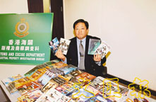 海關版權調查組指揮官莊煒明展示檢獲的盜版光碟。(蔣焯文 攝)