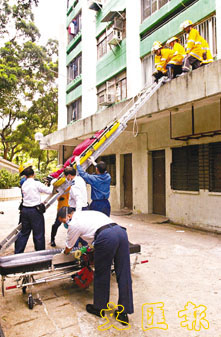 石翠樓的住戶,在昨午1時15分,聲聞重物墮地的巨響,發現一名男子由高處墮下,倒伏一樓平台頭部重創,警方及消防員到場,隨即升起鋼梯,將頭部受傷及身體多處骨折的傷者救下,送抵仁濟醫院後證實傷重不治。