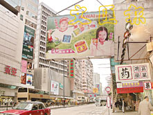 20多年前林添茂在彌敦道善美大廈創業,如今大廈外的日本魚肝油丸巨型廣告牌仍在。 (鄭群 攝)