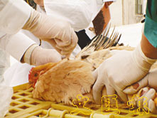 檢驗檢疫局人員正為雞隻抽血取樣化驗。 (鄭海龍 攝)