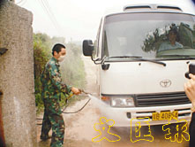 養雞場保安人員為進入雞場範圍的車輛進行消毒。 (鄭海龍 攝)