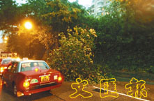 昨晚6至7時許,港島赤柱黃麻角路、柴灣及九龍何文田衛理道,分別發生大樹不敵雷雨倒塌意外,其中在赤柱黃麻角路,倒下的一棵10多米高大樹,呈拱橋形橫跨在兩條行車線上,令大批旅遊巴及巴士無法通過,車輛大排長龍,部分等得不耐煩的巴士乘客,更索性下車冒雨步行,警方召來消防將大樹移往一邊,交通至晚上近8時才逐步恢復正常。