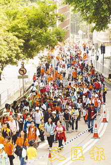 李國章昨日應邀為「全港家長教師會親親百萬行」出任主禮嘉賓,喜愛行山的他,一改以往政府高官只出席開步儀式的習慣,「罕有」地與3000名參加的學生、家長及教師一起行畢全程,由香港大球場出發到香港仔郊野公園,「親力親為」推動家校活動之餘,同時亦為公益金籌款。