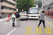 【本報訊】石硤尾街昨早發生驚險車禍。一名9歲女童由母親駕七座位私家車載送上學,女童落車橫過馬路時被對面線的校巴撞倒輕傷,其母從倒後鏡看到心急下車察看,忘記拉手掣,座駕在斜路溜後反衝向校巴及其女兒,千鈞一髮之際7至8名途人衝出馬路,以人力擋車將車「剎停」,女童有驚無險,其母驚魂甫定即時向途人致謝。