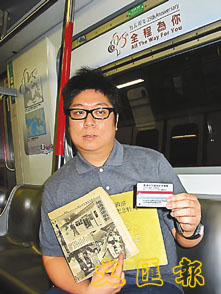 首班地鐵乘客張兆文展示當日的車票及紀念冊。 (施立偉攝)