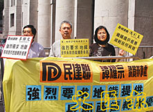 民建聯昨在立法會門外請願,要求地鐵繼續延長轉乘優惠。 (羅敬文 攝)
