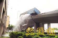 觀塘偉業街天橋昨晨發生驚險交通意外,一輛貨櫃車疑為閃避一個高空飄至的氣球剎掣失控,猛然撞向路礐翻側,車身壓毀20米鐵欄及一個消防水龍頭,水花四濺,拖架上的貨櫃門被震開,所載電腦顯視屏部分更散落15米下路面,幸未擊中途人,司機一度被困需由消防員救出。