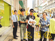 警察帶一名「冒牌」扒手遊街示眾,以宣揚「提防扒手」訊息。 (聶曉輝 攝)