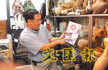 古董店店東楊先生向記者講述漢代陶瓷。 (蔣焯文 攝)