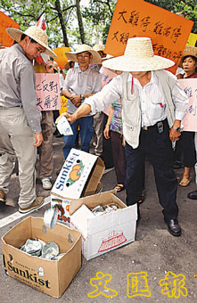 雞農代表到政府總部請願,打破飯碗宣洩不滿。(李志樑 攝)