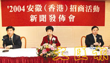 據文海英介紹,安徽省對此次來港招商非常重視,省委書記王太華、省長王金山親自率領超過300人的代表團參加,將於下周一(17日)到港。此次安徽重點推出212個招商項目,涉及的投資額達73億美元,項目包括基礎設施、國有資產併購、高新技術、現代服務和農業產業化等。此次安徽省來港招商的重頭節目是下周二上午十點在香港會議展覽中心舉辦的「2004安徽(香港)投資說明會」。