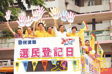 由於距離選民登記截止只有兩天,民建聯昨日派出主席馬力擔任主帥,副主席葉國謙和譚耀宗、成員蔡素玉、劉江華、鍾樹根等助陣,在筲箕灣巴士總站對開空地以「火速登記」作為口號,號召市民盡速登記做選民。他們穿著印有民建聯標誌的黃色戰衣,在登記站一字排開,拿著「火箭」對天發射,啟動今次的大型登記活動。