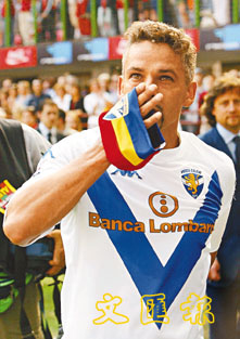 巴治奧在意甲踢最後一仗後親吻布雷西亞的隊長臂章。 (路透社)