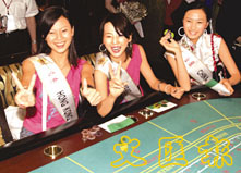 「世界名模在澳門」。圖為模特兒昨到葡京酒店水晶宮娛樂場,興高采烈地搏殺起來。(中新社)