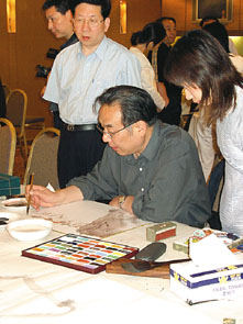 多位名家的畫相信大家見得多,然而名家作畫你見過沒有?筆會一開始,各人便已磨硯蘸墨,提筆直抒,他們包括有山水畫大師傅抱石之子、以山水人物聞名的畫家傅二石,有江蘇省美術館館長宋玉麟﹝著名山水畫家宋文治之子﹞,有江蘇省國畫院一級美術師蕭平等。各人或書或畫,題材各異,小心點染,大筆潑墨。素來喜歡將人物與大自然融為一體的傅二石,即場畫了兩幅山水畫,開闊的山水之間,可見人物形象藏於其中,或行山吟嘯,或弈棋為趣,表達了人與自然的和諧。