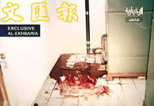 電視畫面所見,被劫持人質的房間內血跡斑斑。(路透社)