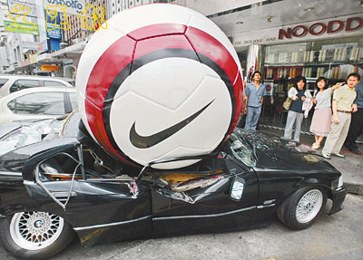 曼谷街頭周一發現罕見意外,一個宣傳歐洲國家杯的巨型足球突然從天降下,把停在街上的一輛名貴寶馬房車壓得破爛。 (路透社)