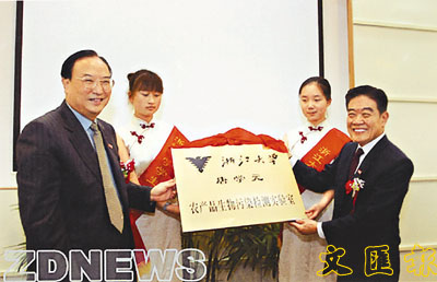 浙江大學黨委書記張浚生出席生物污染檢測實驗室揭牌儀式,代表學校接受唐的捐款,隨後陪同唐學元先生為實驗室揭了牌。儀式由副校長程家安主持,浙江省僑務辦方士榮副主任、學校發展委員會、農學院及校區管委會的有關領導及師生代表出席了儀式。張浚生書記向唐學元先生頒發了顧問教授聘書及為他戴上校徽。