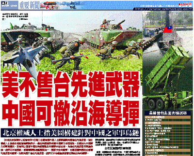 【本報北京新聞中心記者京伴6日電】此間有關方面人士嚴厲譴責美國售台先進武器。這位權威人士接受本報記者詢問時表示,最近美國發表所謂中國軍力年度報告,刻意誇大中國軍力和軍費開支,別有用心宣稱中國沿海部署數百枚導彈針對台灣,為售台先進武器作輿論準備。我們可以這麼說,部署導彈是維護國家統一、國家安全的需要,也是因應美國在台部署先進武器的需要。如果美國不售台先進武器,我們可以考慮撤掉部署在東南沿海的導彈。