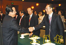 曾慶紅與唐英年握手表歡迎。 (中新社)