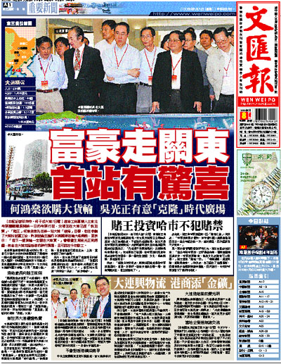 【本報記者邱萍菲、何子成大連7日電】港澳工商專業人士東北考察團剛剛展開第一日的考察行程,沒想到在大連已經「執到寶」。「賭王」何鴻燊首先在第一站大連「獵獲」目標,他在參觀了大連新船重工後,對該船廠生產的30萬噸原油輪大感興趣,更表示:「我下一艘貨輪一定要在大連買。」會德豐主席吳光正則透露,有意在大連克隆香港的時代廣場,且可能在今年動工。